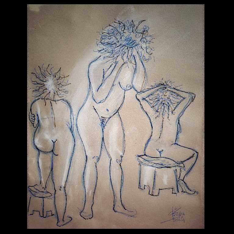 Des dessins classiques au crayon à l'encre etc... D'autres entièrement numériques et d'autres encore avec des allers-retours entre dessin classique et remodelage digital ou des retouches photos mélangés aux dessins, enfin des trouvailles au gré du temps ...du moment et de l'inspiration...